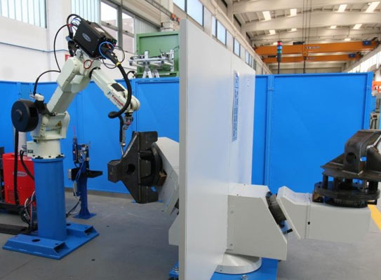 Con robot di saldatura e manipolazione Kawasaki; Numero tavole: 2; Numero assi: 11